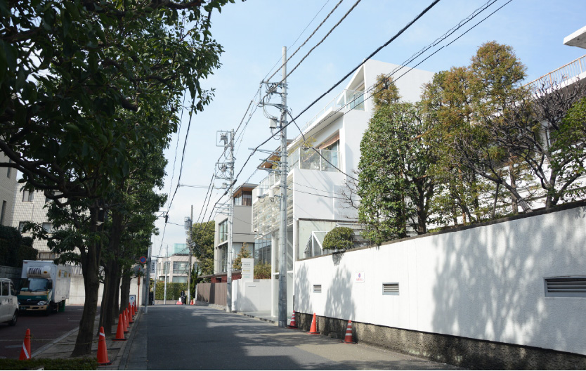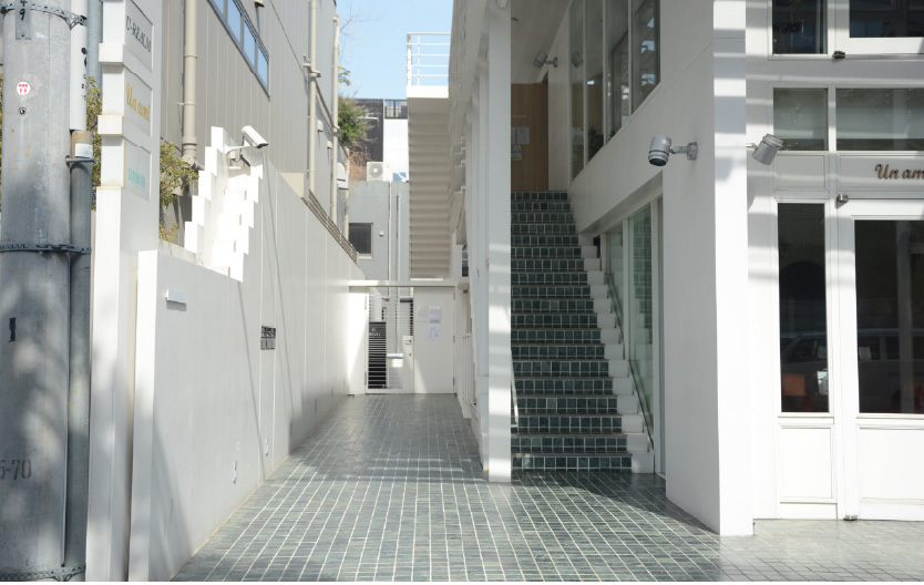 建物を正面に、左側奥の白い鉄作の扉がCRAFY表参道店の入り口。