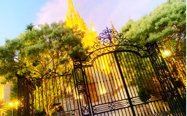 有名なドラマにも使われている結婚式場は近くで見るとより壮大で美しく、夕暮れ時にライトアップされた姿はとてもロマンチックです。