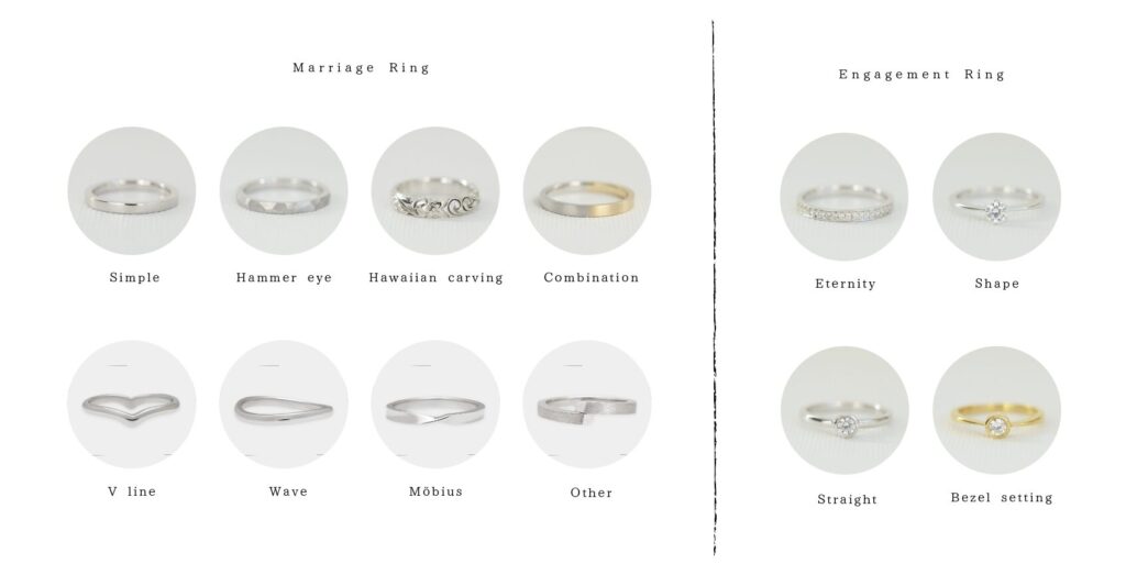 For wedding rings, the price is calculated based on the weight (amount of metal) of the ring to be made. It varies depending on the width, size, and design. The minimum price is ¥37,000 for one ring plus a production fee of ¥11,000. (Most are in the range of ¥50,000 to ¥60,000.)