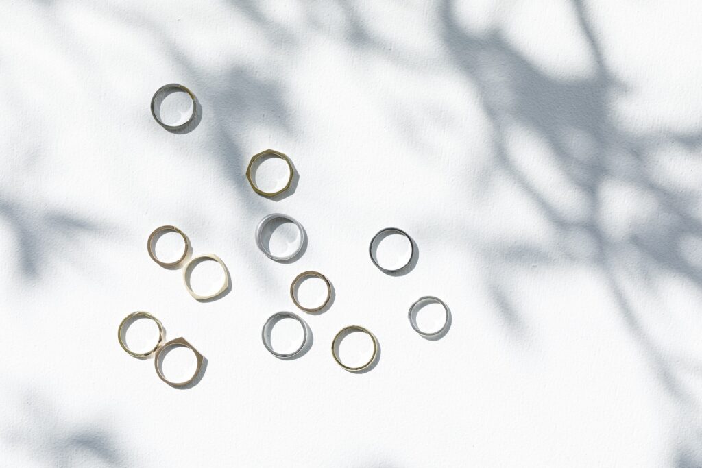 たとえば、シンプルで指なじみのよい甲丸型や、シャープな印象の平打ち型、クラフト感を演出できる槌目(つちめ)仕上げなどが代表的です。