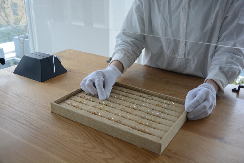 店頭にはサンプルリングや実例が多数用意されており、リングの形状や幅、素材、仕上げ方法、宝石の有無などを具体的に検討できます。