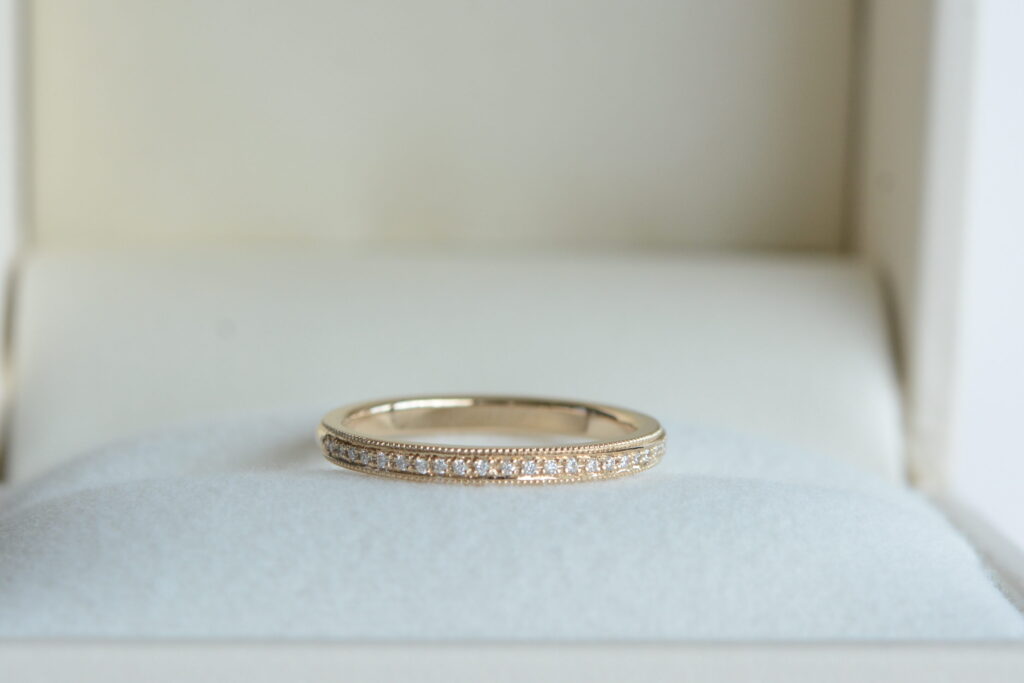 メレダイヤやエタニティのように華やかさを演出するデザインもあれば、内側にさりげなく宝石を忍ばせる方法もあります。