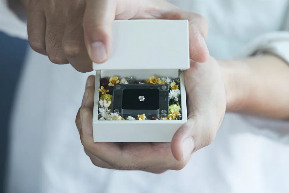 プロポーズ後にお二人でご来店いただき、お好みのデザインで指輪を手作りしていただきます。贈ったダイヤモンドを職人が指輪にセットして婚約指輪の完成です。