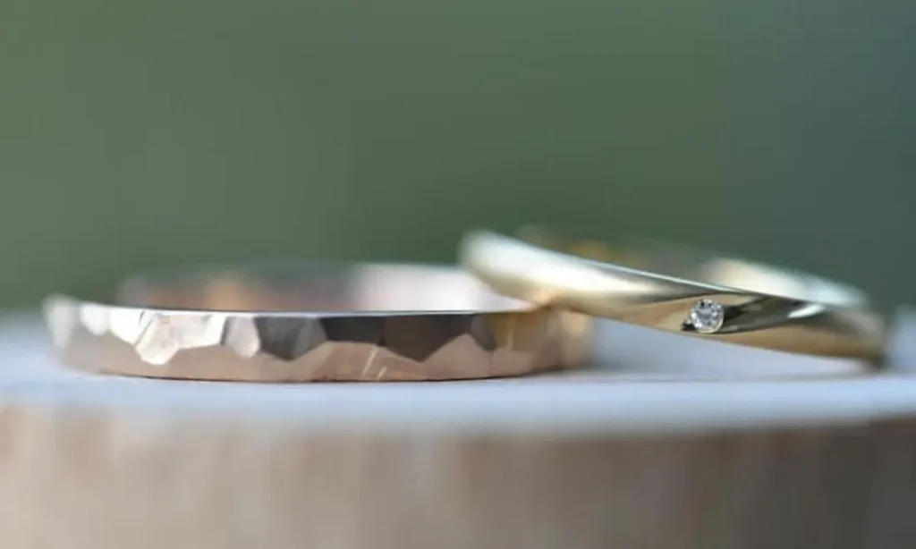 指輪のデザインは、おふたりともご自身の個性を大切にされ、それぞれ異なる素材とデザインにされ素敵な結婚指輪となったと感じます。