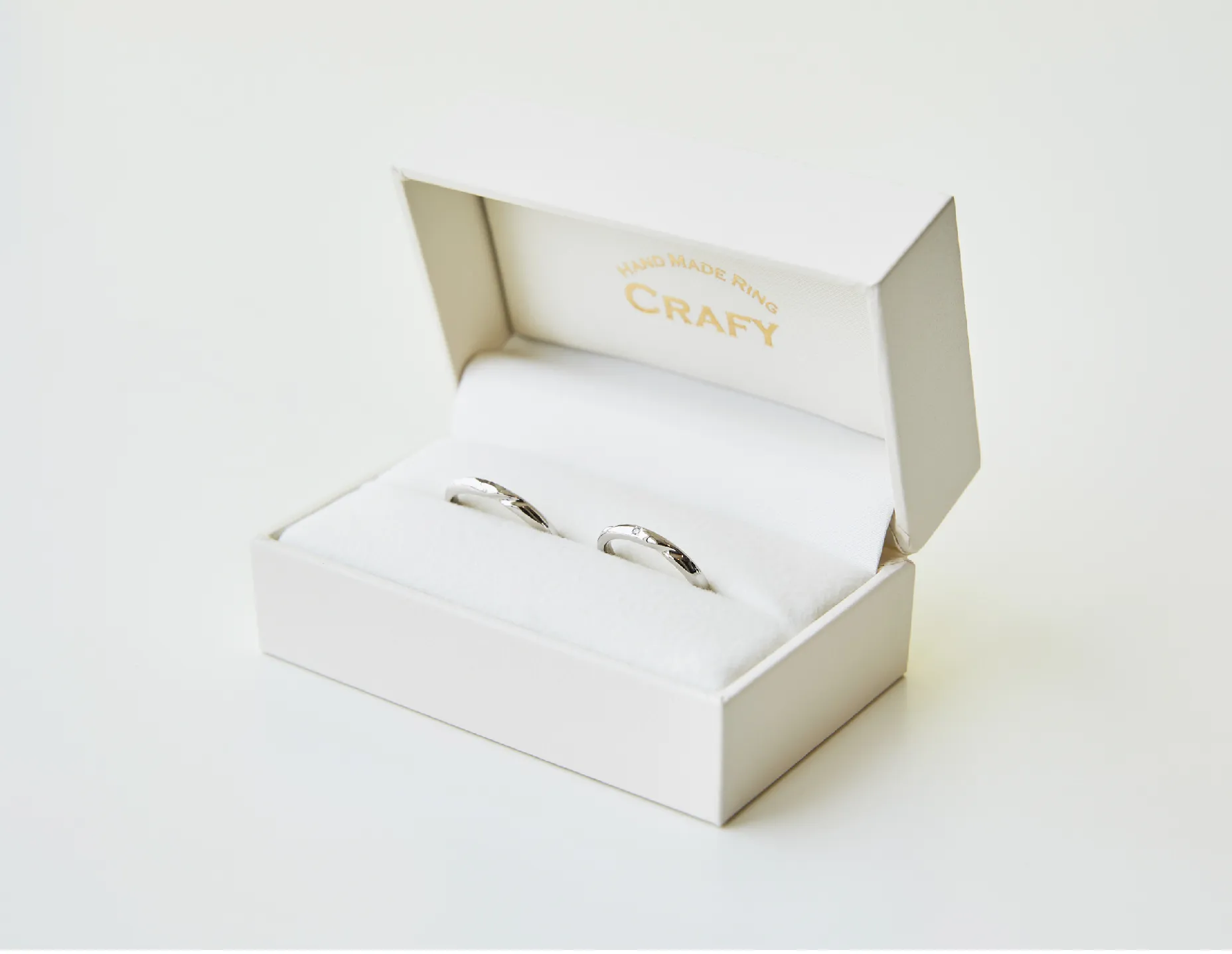 ふたりの指輪を大切に保管するケースはどんなデザインの指輪も引き立つ、白を基調としたシンプルなオリジナルデザイン。