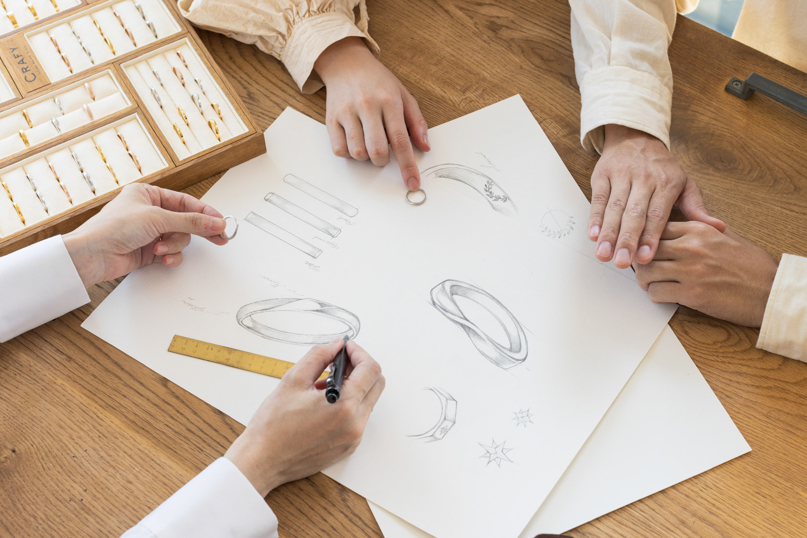 指輪の作り方、デザイン、CRAFYで選べる素材や加工について、丁寧に説明いたします。